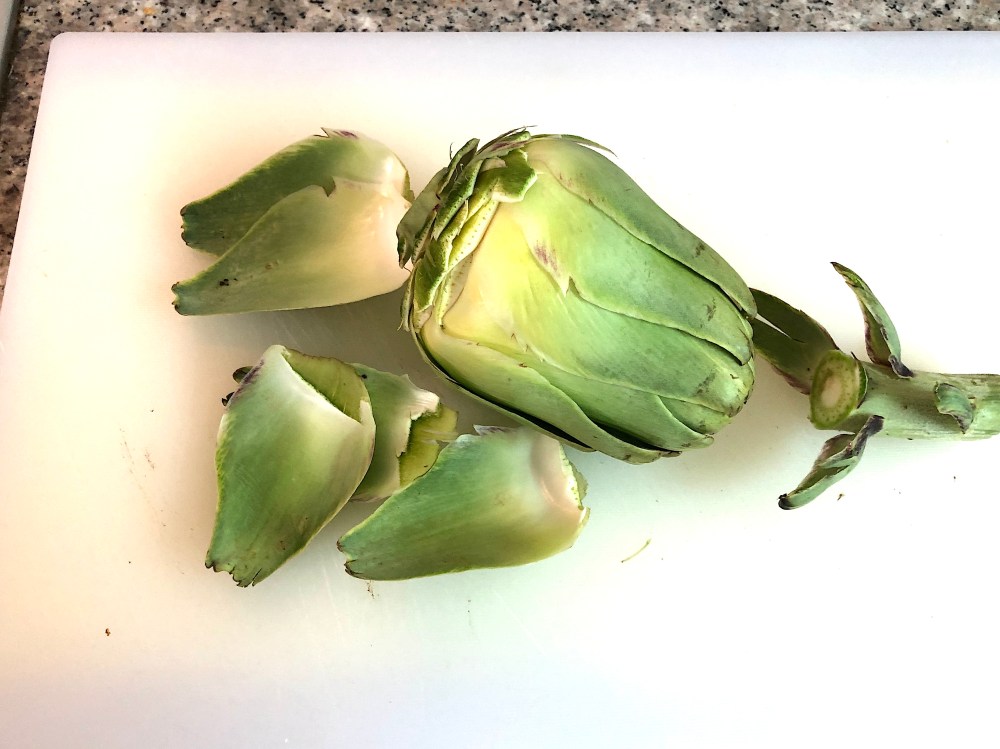 Von der frischen Artischocke die äußeren, harten Blätter großzügig entfernen.