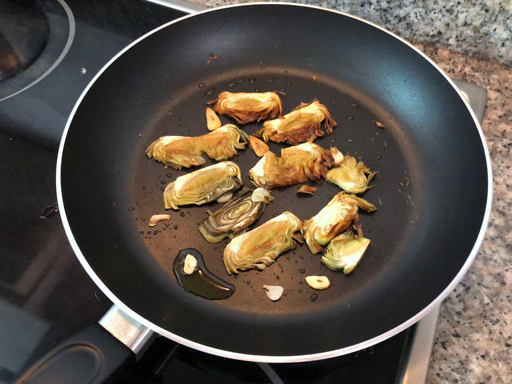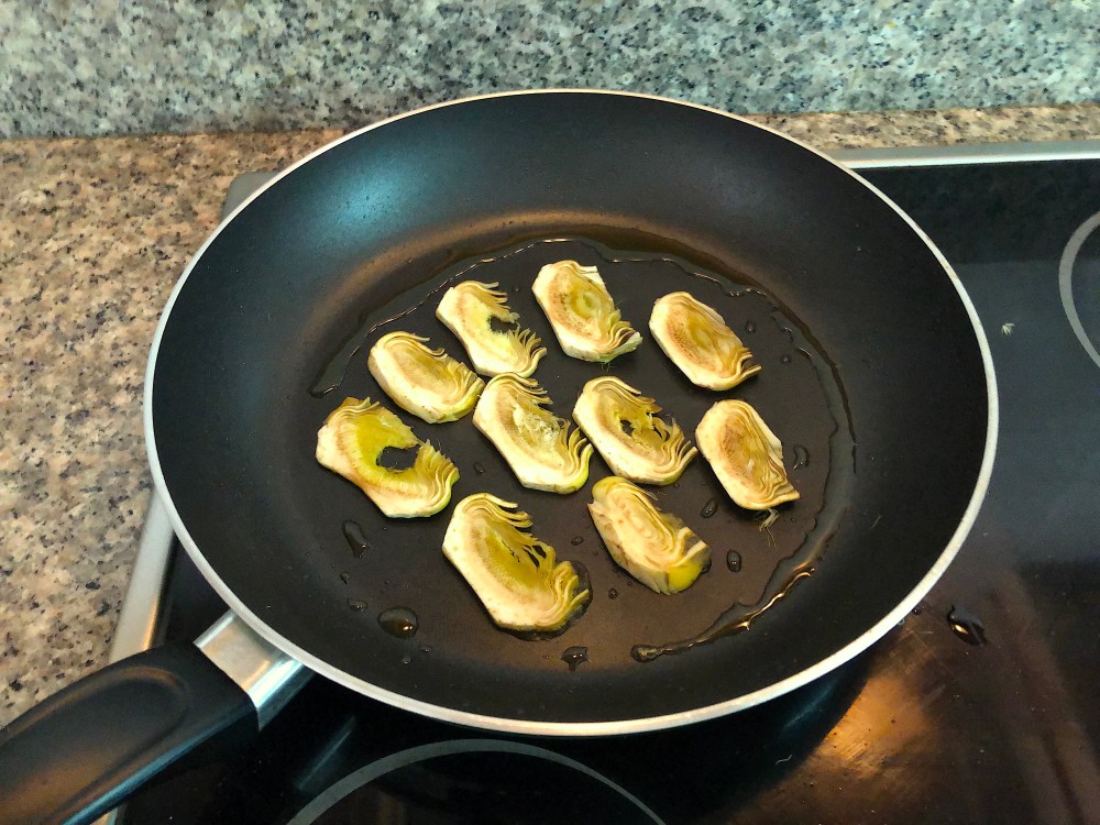 Die frischen Scheiben von der Artischocke in eine heisse Pfanne mit ein paar Tropfen gutem Olivenöl vorsichtig einlegen. Anbraten und mit dem Spatel wenden.